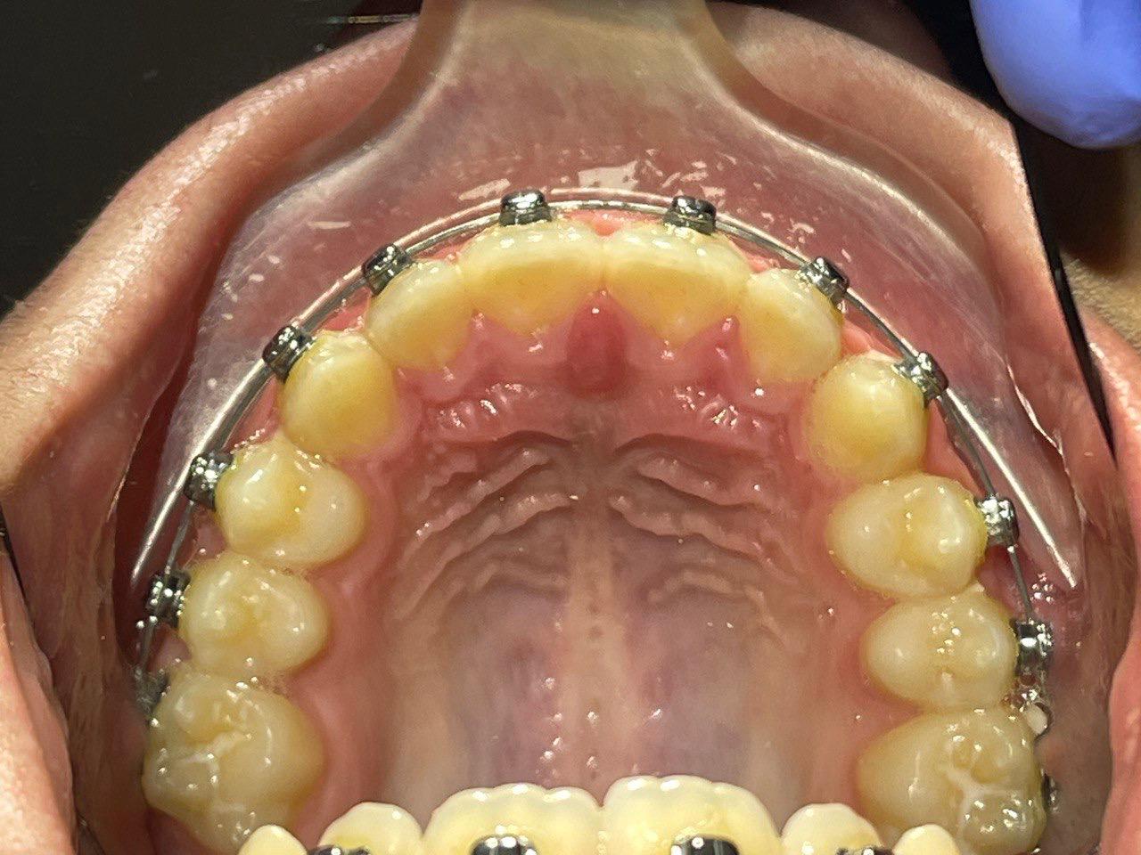 • Сужение верхнего зубного ряда, сужение и уплощение нижнего